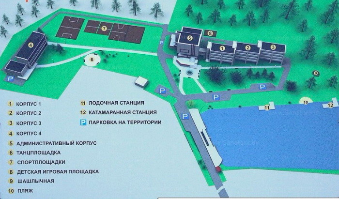 Санаторий расположен на берегу водоема и имеет собственный оборудованный лежаками и кабинками для переодевания пляж.